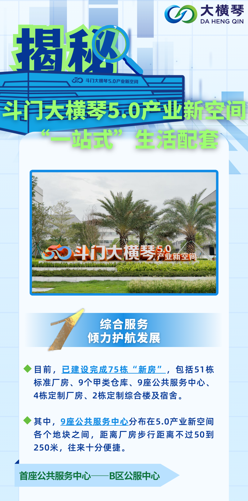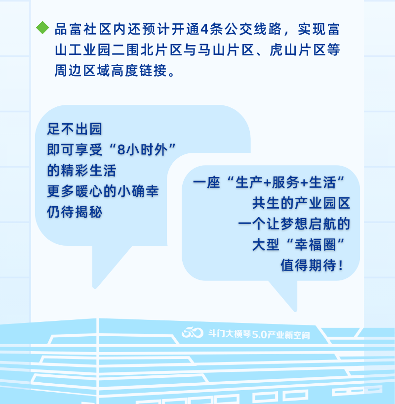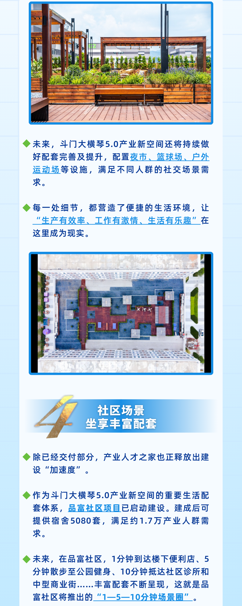 新空間,托起產業新夢想。作為一座能“拎機投產”“拎包入住”的高質量園區,斗門大橫琴5.0產業新空間不僅適應新形勢、賦能新技術、承載新產業,還配備能滿足員工吃、住、娛樂休閑等需求的生活、商業配套。