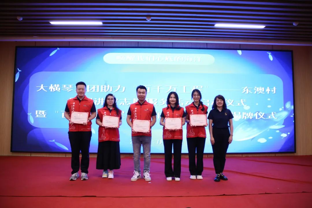 儀式上,共青團珠海市委員會權益與社會工作部部長王臻,珠海市萬山鎮人民政府黨委副書記、鎮長黃軒流,珠海大橫琴集團有限公司黨委副書記戴碩濤,珠海市萬山鎮東澳村書記石志明,萬山海洋生物科普館館長安東共同為“百千萬工程”青年志愿服務崗揭牌,啟動助力“百千萬工程”——東澳村暑期講解志愿服務活動。