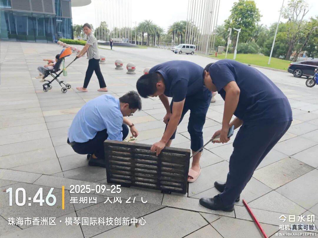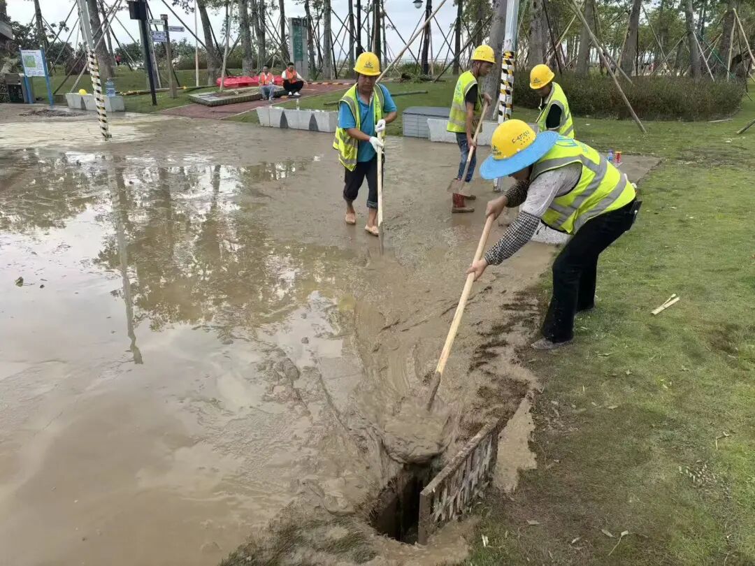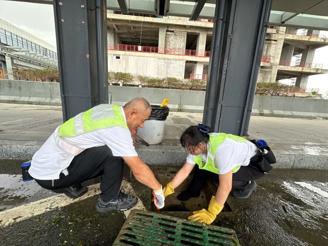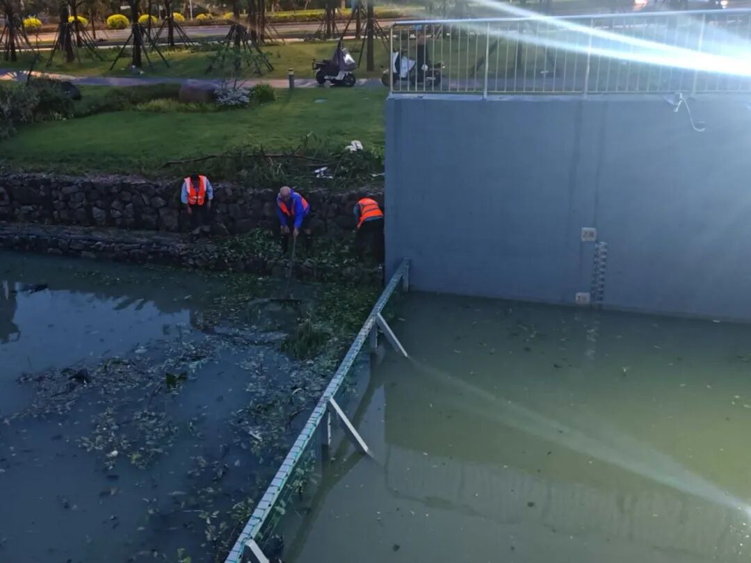 臺風期間,受風暴潮影響,橫琴天沐河水位上漲,珠光集團迅速組織搶險力量,通過加筑沙袋有效阻止海水倒灌進天沐河,同步安全轉移設備設施,并緊急安裝抽水設備清理積水,避免變電房被水浸泡。臺風過境后,搶險隊伍立即投入后續清理工作,第一時間清理泵站進水口垃圾,保障泵站排水通暢,降低村渠水位;清理排水口垃圾,保障土渠排水暢通;并全力協助合作區市政管理署,清理倒塌的邊境圍網。